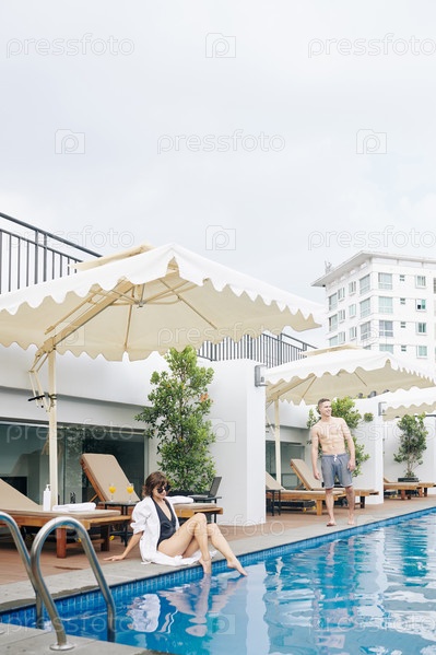 Люди отдыхают у бассейна