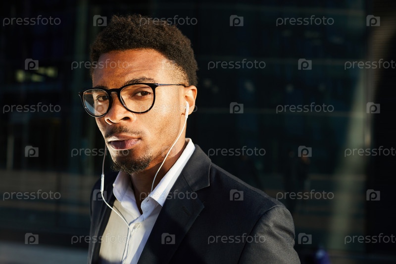 Портрет серьезного красивого молодого бородатого чернокожего бизнесмена в стильных очках, слушающего новости на радио с наушниками
