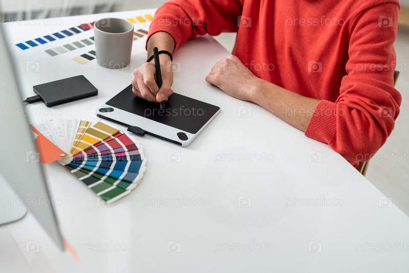 Руки молодого внештатного дизайнера, ретуширующего фотографии на экране графического планшета