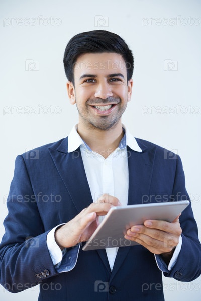 Счастливый бизнесмен с цифровым планшетом