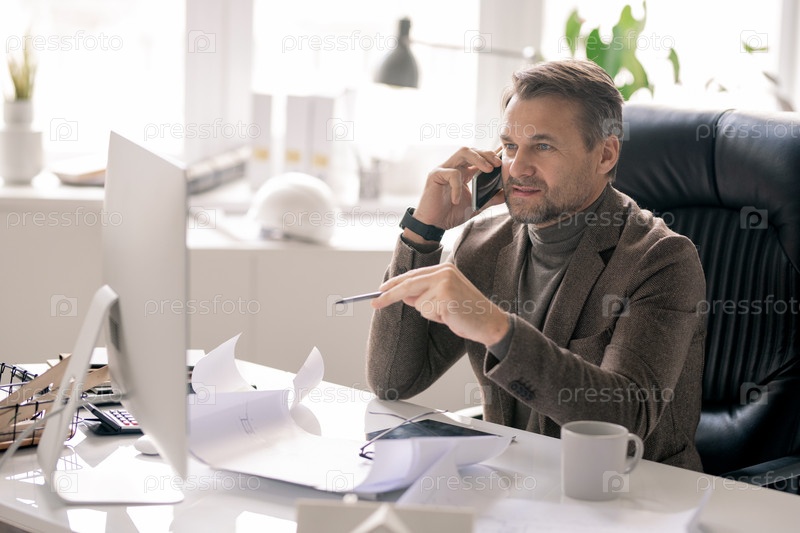Уверенный в себе архитектор разговаривает по телефону, показывая на экран компьютера