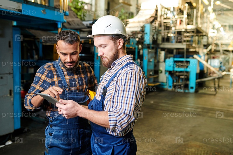 Серьезные вдумчивые мультиэтнические фабричные инженеры в униформе стоят в промышленном магазине и используют планшет, анализируя эскиз онлайн