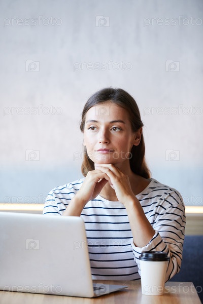 Серьезный мыслящий интернет-маркетолог в повседневной одежде сидит за столом в кафе и опирается головой на руки, думая о веб-дизайне