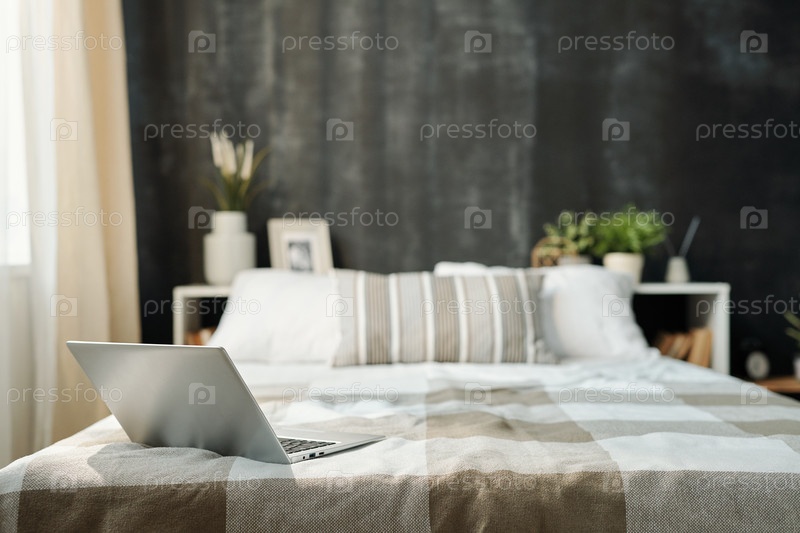 Откройте ноутбук на аккуратно сделанной кровати с бельем, квадратным чемоданом и подушками