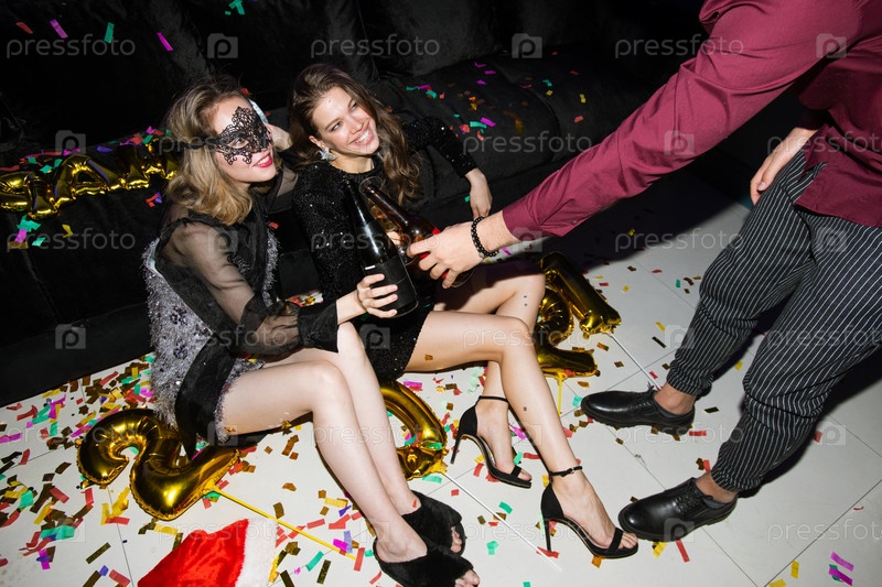 Веселые девушки с бутылками выпивают молодому человеку, сидя на полу