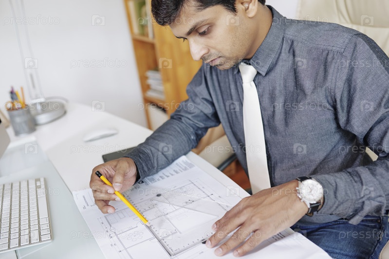 Инженер, измеряющий чертеж