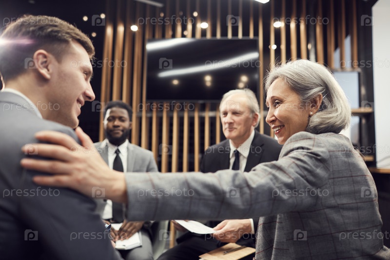 Улыбающаяся зрелая азиатская бизнесвумен с седыми волосами сидит среди коллег в конференц-зале и прикасается к плечу молодого специалиста, отмечая его успех