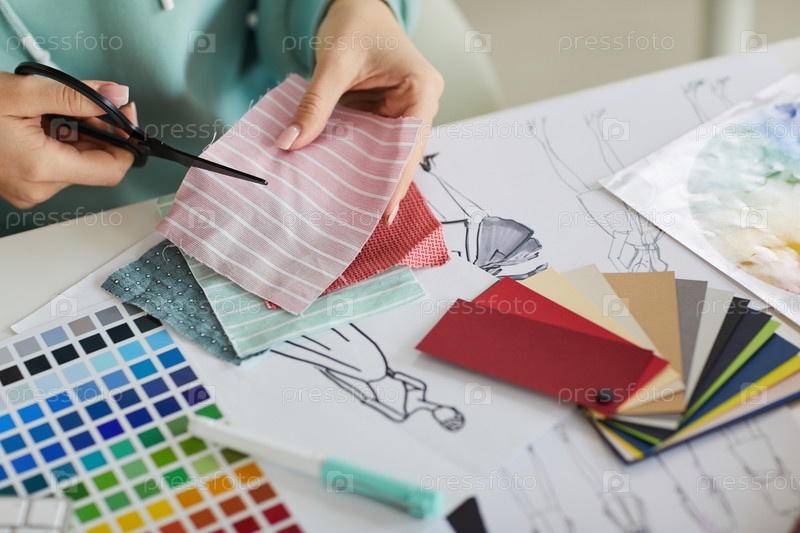 Близкий план неузнаваемой женщины, сидящей за рабочим столом с палитрами и модными эскизами и режущей тканью в студии портных