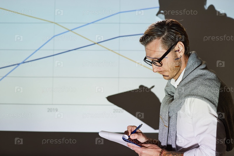 Серьезный задумчивый молодой оратор со стержнем, стоящий на проекционном экране с графической картинкой и записывающей информацию в клипборд