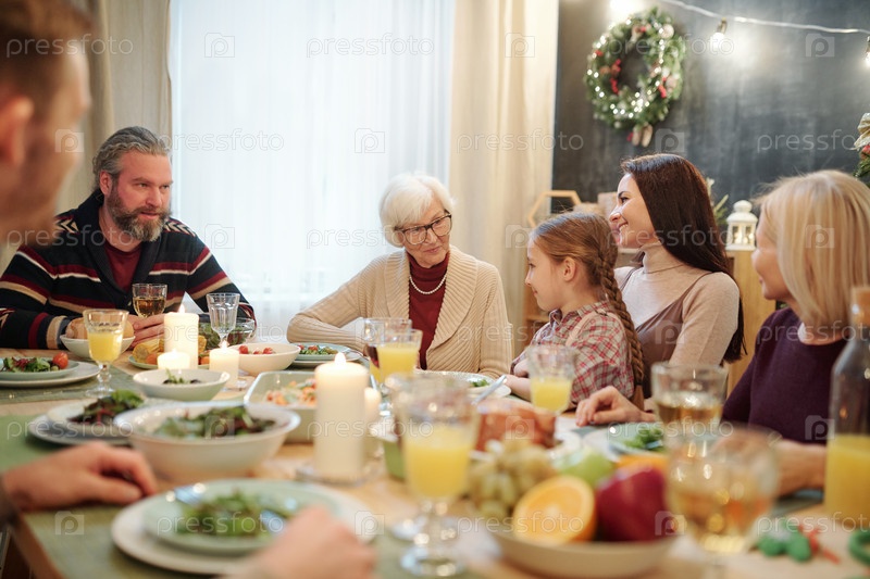 Старшая женщина смотрит на свою правнучку во время чата за приготовленным столом