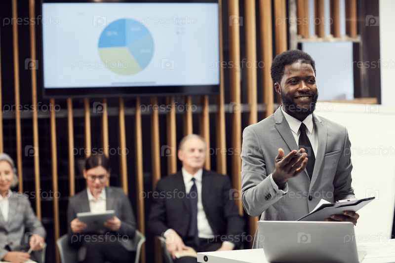 Веселый красавчик, молодой чернокожий бизнесмен с бородой стоит за столом для выступлений и держит в руках доску при обмене стратегией развития на конференции