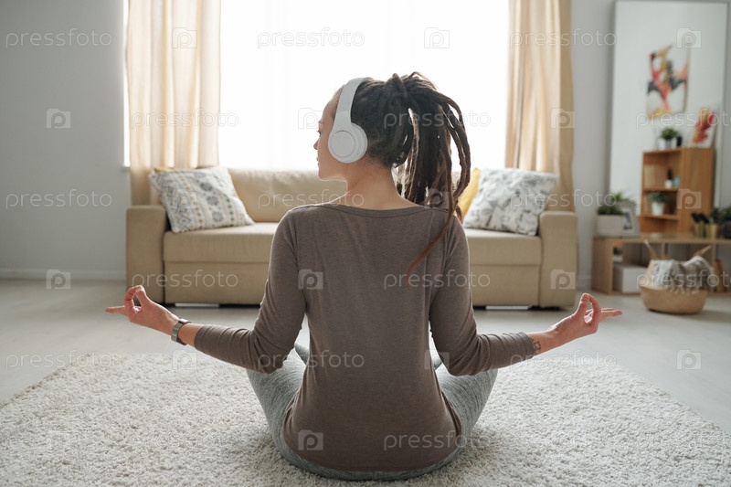 Девушка слушает расслабляющую музыку в наушниках, сидя в позе лотоса