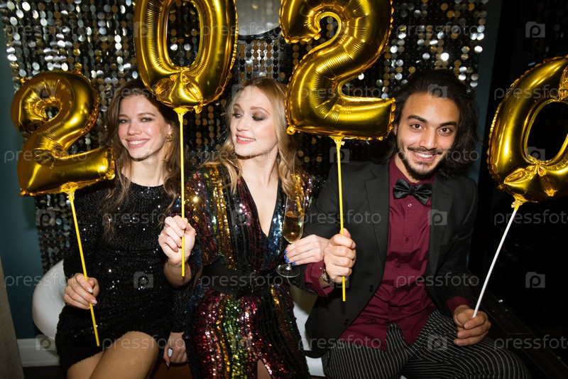 Счастливые молодые друзья, держащие золотые надувные номера следующего года