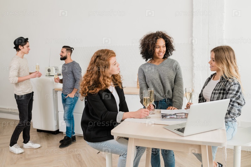 Три молодых женщины с шампанским обсуждают что-то за столом