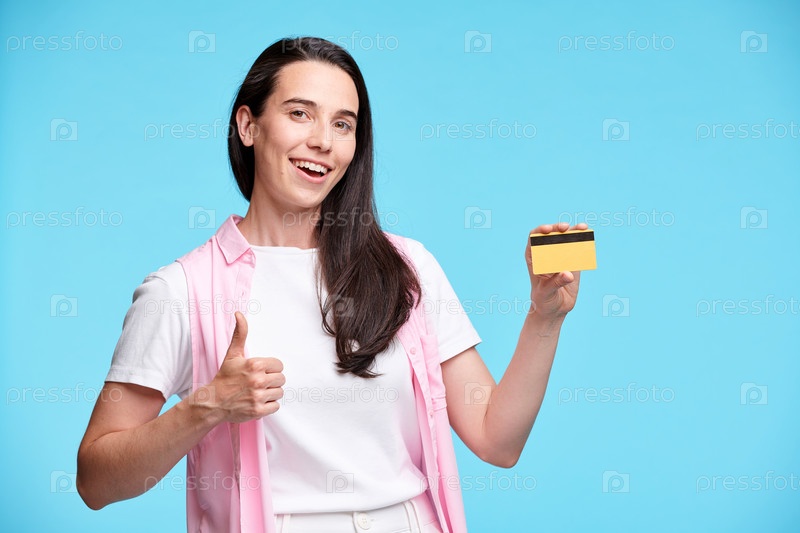 Счастливая молодая женщина, пристрастившаяся к покупкам и показывающая жест поднятия большого пальца и пластиковую кредитную карту