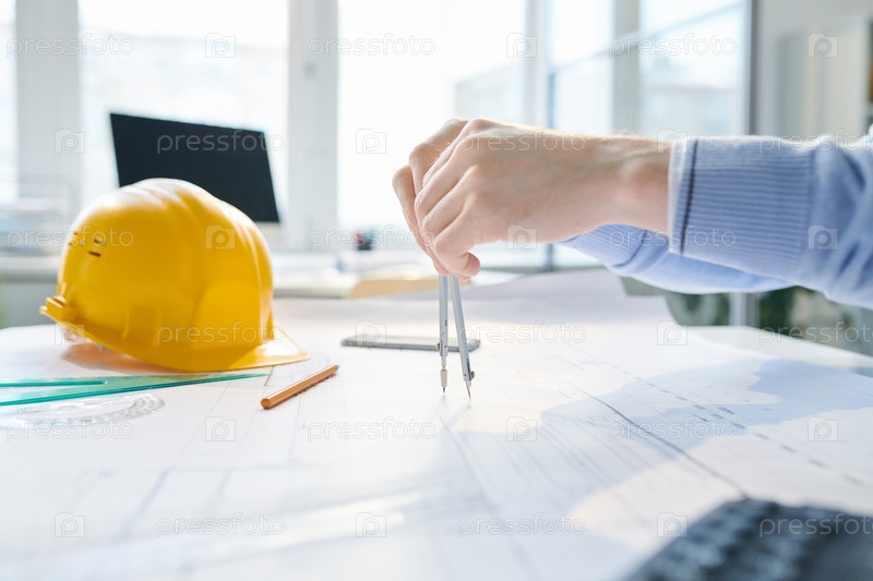 Близкий план неузнаваемого мужчины с помощью технического инструмента рисования во время составления дуг на чертеже