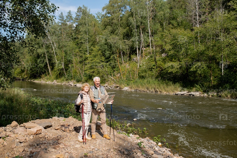 Пожилая пара с картой стоит у лесной реки, собираясь найти дорогу обратно