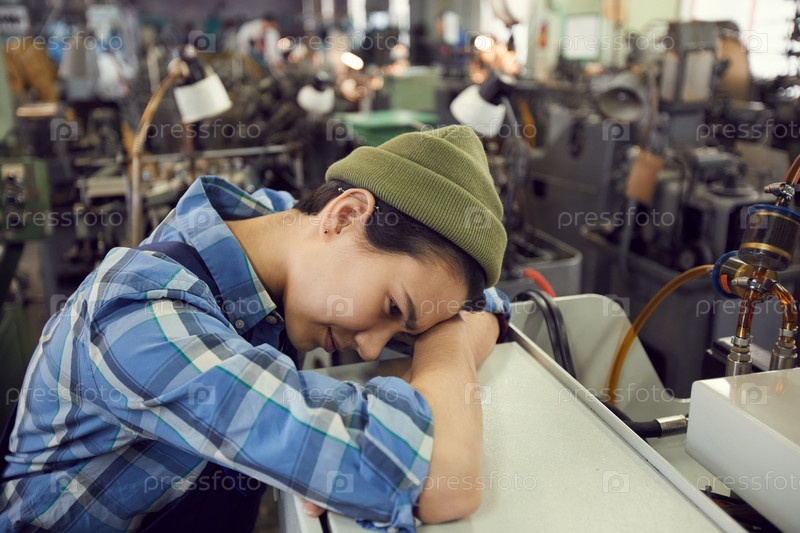 Усталая молодая женщина-производитель в зеленой шляпе устала от работы, опираясь на фабричную машину