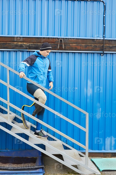 Серьезный молодой красивый бегун с протезированной ногой, с трудом спускающийся по лестнице и держащий перила