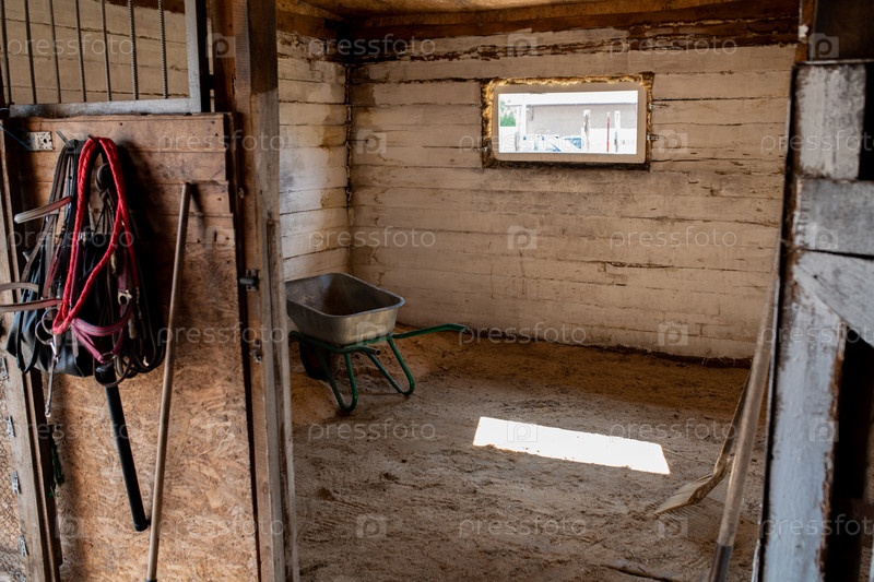 Пустая конюшня для скаковых лошадей с небольшим окном, рабочими инструментами и тележкой