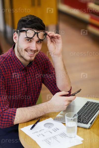 Оптимистичный успешный молодой предприниматель-мужчина, сидящий за столом с ноутбуком и бумагами и смотрящий на камеру во время работы с финансовыми данными в кафе
