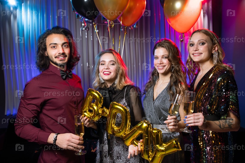Три счастливых девушки и молодой человек, держащие флейты с шампанским и шарики