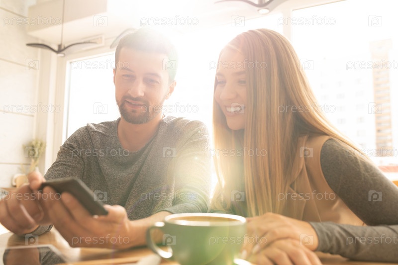 Красивая молодая женщина и ее парень просматривают онлайн-вещи на смартфоне