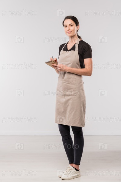 Красивая официантка в фартуке, черные худые джинсы и футболка делают заметки в блокноте