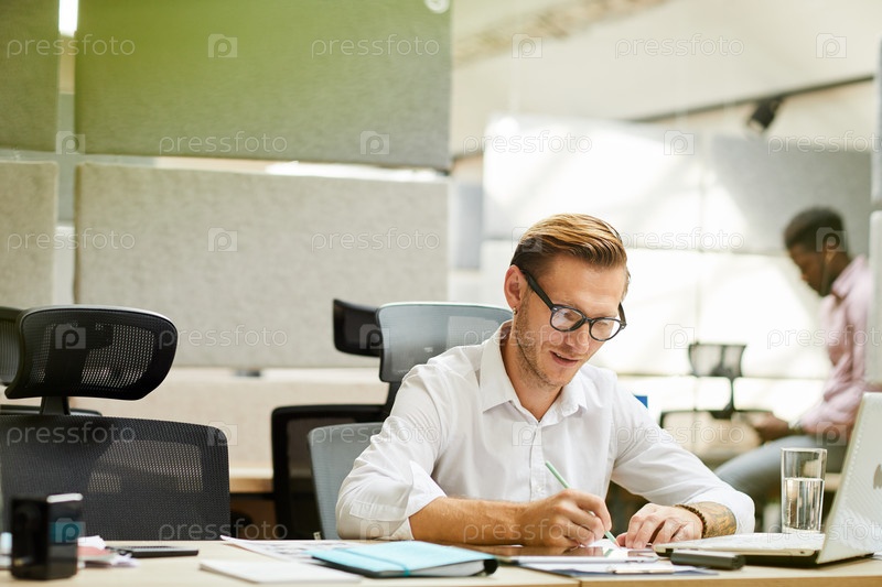 Удовлетворенный молодой человек в белой рубашке, сидящий за столом в открытом офисе и заполняющий бумагу