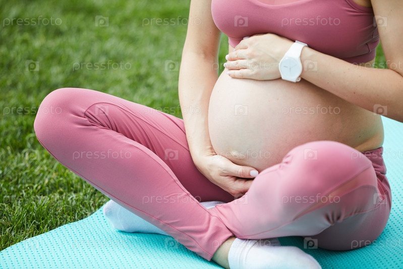 Беременная женщина занимается спортом в парке