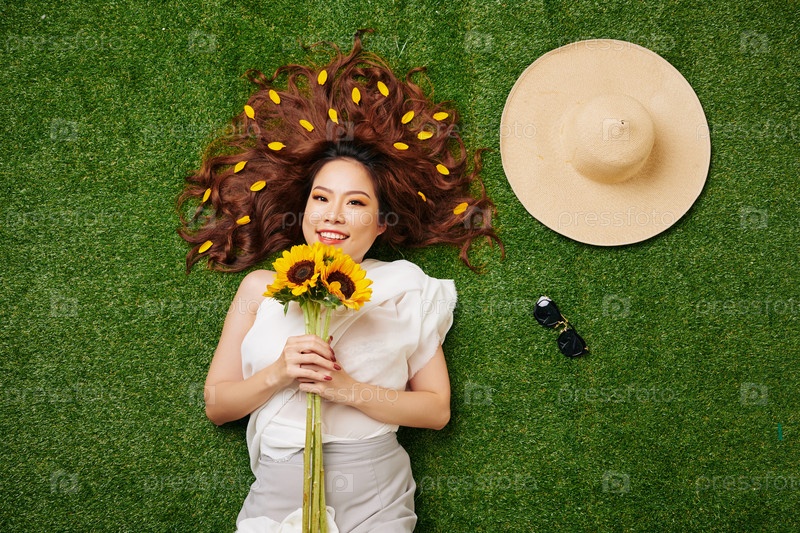 Женщина с подсолнечками на траве