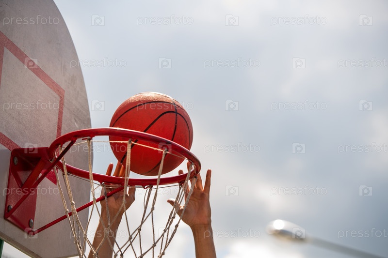 Руки молодого баскетболиста, бросающего мяч в корзину во время игры