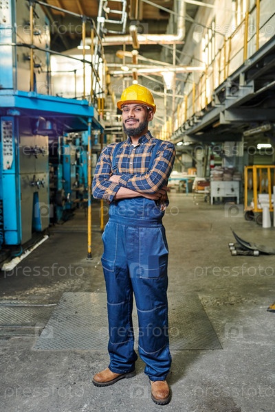 Позитивный уверенный молодой бородатый инженер в форме, стоящий в современном фабричном магазине и смотрящий на камеру