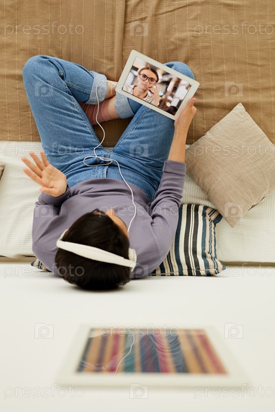 Выше вид молодой женщины в джинсах, сидящей на кровати и жестикулирующей рукой во время разговора с другом через интернет-приложение на планшете