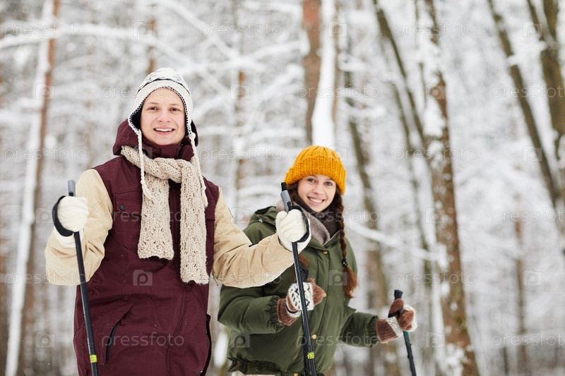 Улыбающаяся пара катается на лыжах в лесу