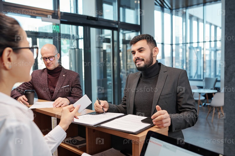 Бородатый молодой бизнесмен с ручкой смотрит на женщину-рецепционера у прилавка