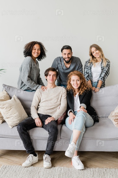 Группа молодых веселых и дружелюбных мужчин и женщин в повседневной одежде смотрит на вас