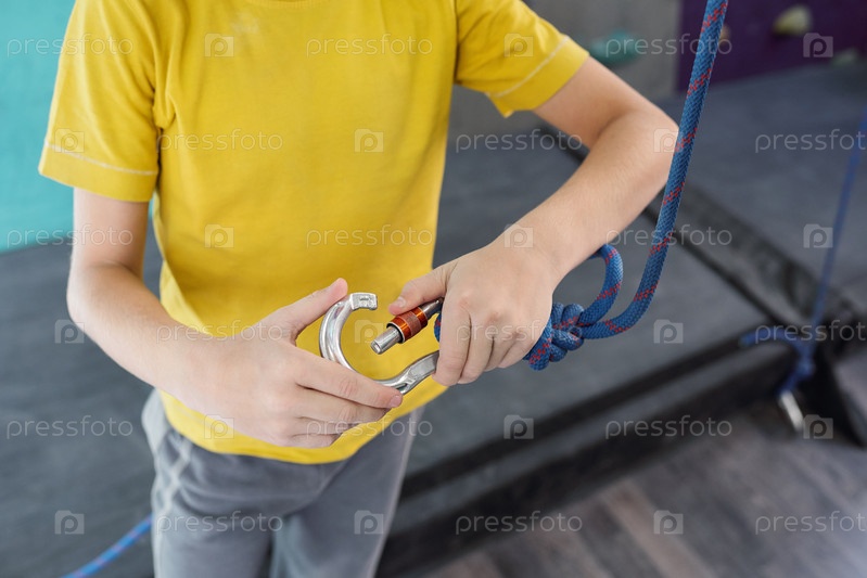 Активный мальчик держит карабинер с веревкой, готовя оборудование для восхождения