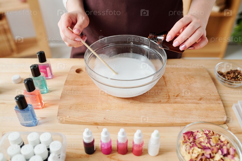 Молодая женщина наливает эфирное масло из маленькой бутылки в жидкую массу мыла