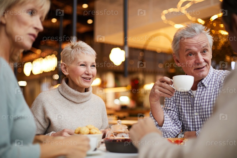 Группа положительных эмоциональных пожилых людей, сидящих за столом в современном кафе и разговаривающих во время совместного чаепития во время завтрака