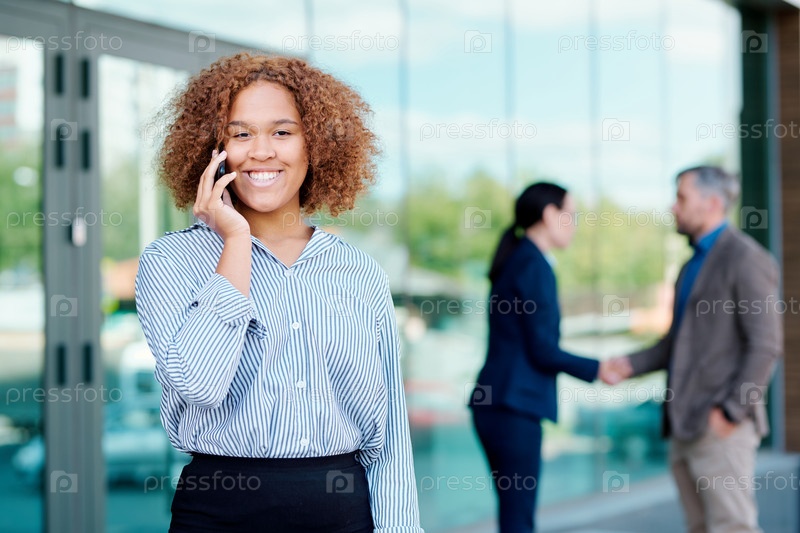Молодой веселый сотрудник смотрит на вас, когда звонит по смартфону