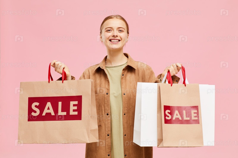 Портрет счастливой возбужденной молодой женщины в обычной рубашке, держащей много пакетов с покупками, она наслаждается хорошим днем покупок