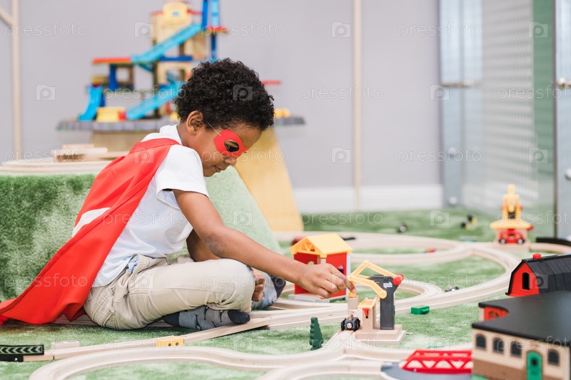 Милый мальчик в красном плаще Супермена играет в детском саду