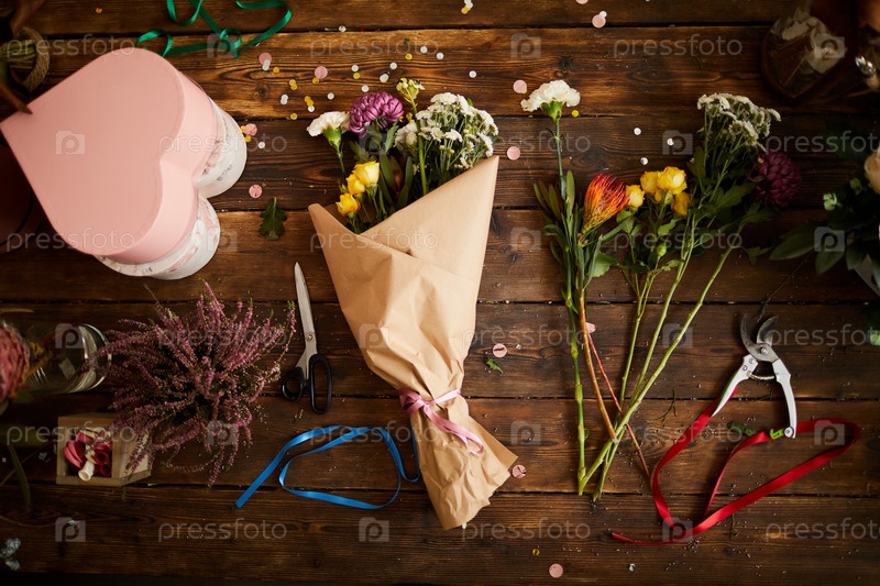 Изготовленные букеты на заднем плане