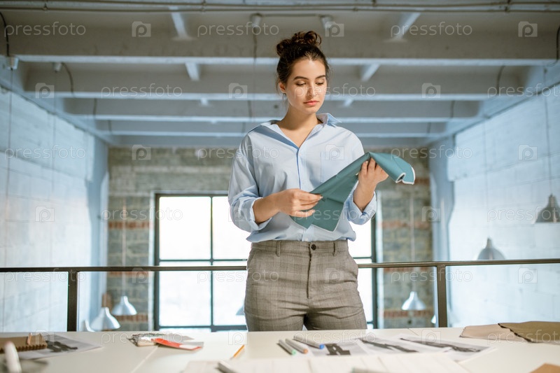 Красивый молодой дизайнер одежды держит образцы текстиля при выборе ткани