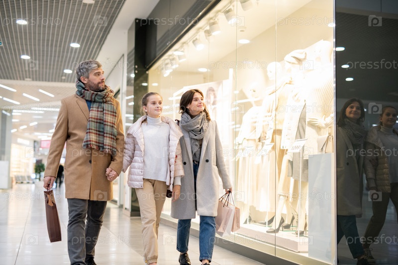 Счастливые родители и дочь смотрят на новую коллекцию повседневной одежды в витрине