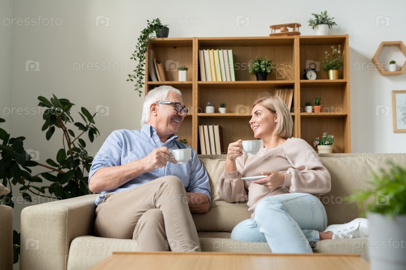Счастливая женщина и ее старший отец пьют чай, сидя на диване и разговаривая