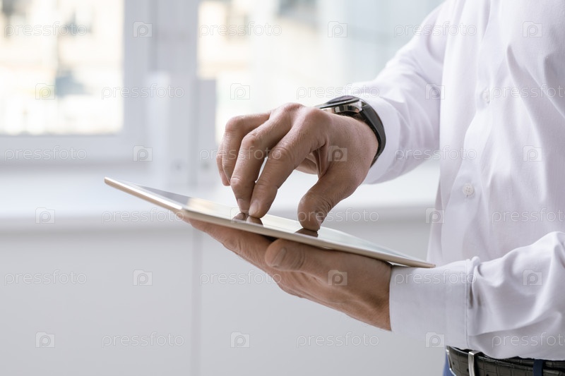 Руки бизнесмена с цифровым планшетом над сенсорным экраном, готовя презентацию