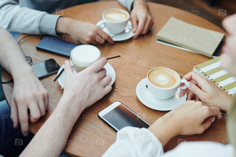 Руки коллегиальных друзей с гаджетами и напитками собрались за столом в кафе