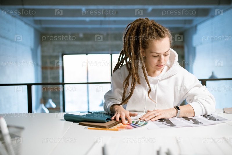 Молодая модельера смотрит на эскизы на столе, выбирая цвета